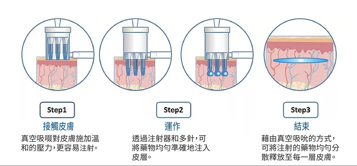 一次可以注入2cc高強度高濃度的護膚精華,兩到四週一次,三到五次後,就能翻轉皮膚的膚質。