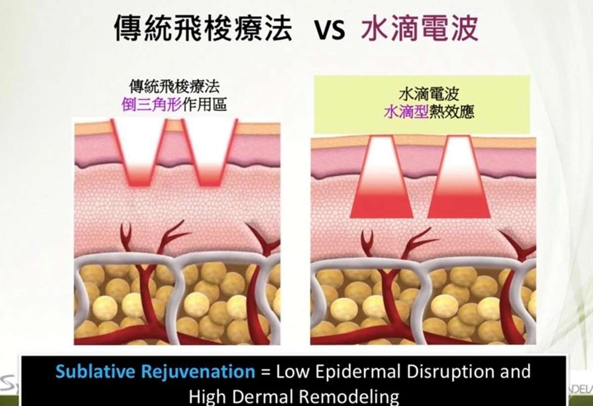 只要客戶的皮膚穩定健康,對於凹洞痘疤來說,水滴電波三次的效果,比皮秒蜂巢和飛梭三次的效果更好。和飛梭比較起來,也較不會疼痛,也比較不容易反黑。