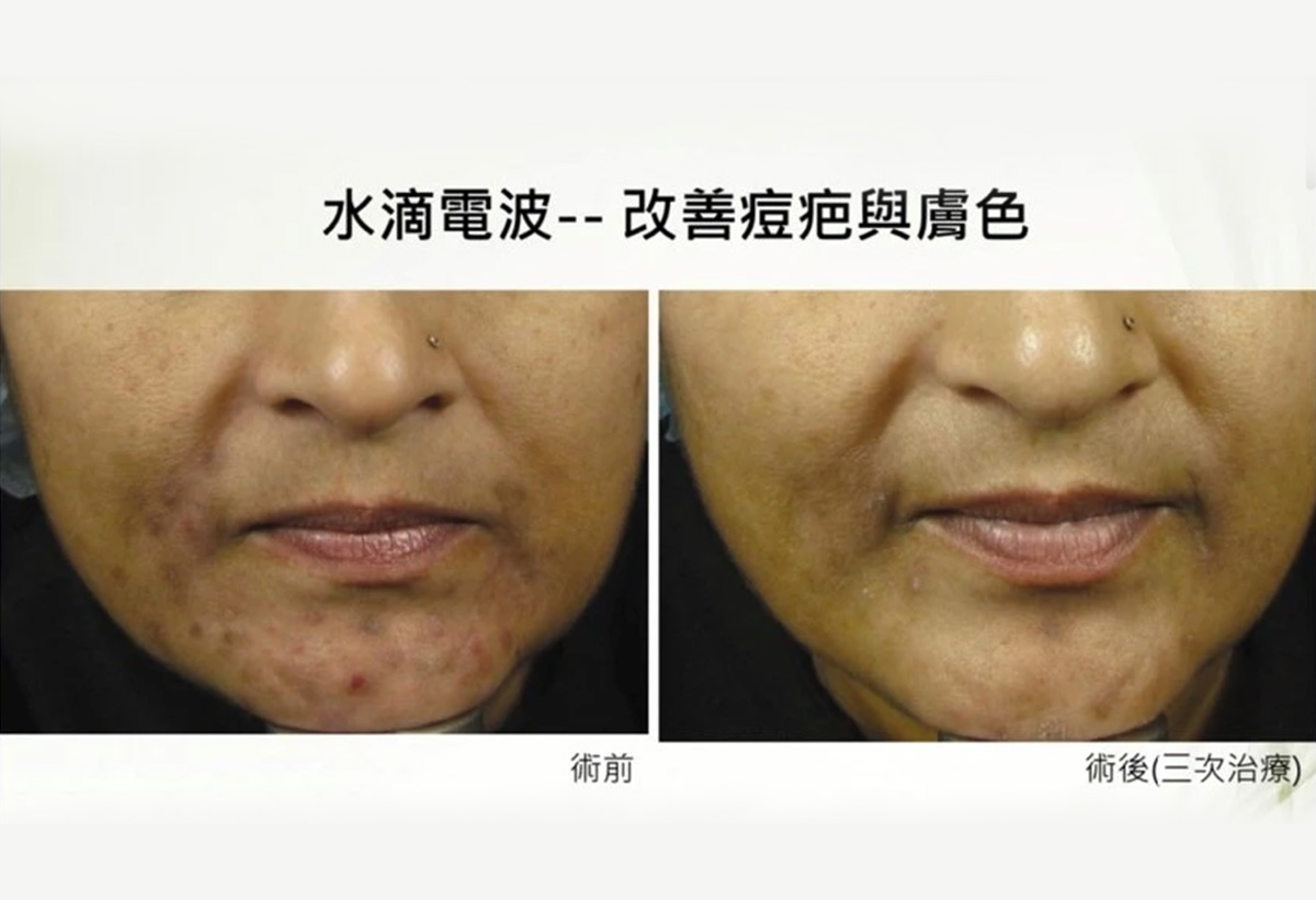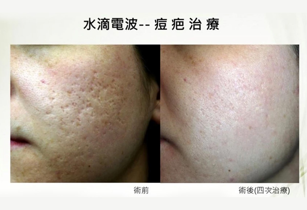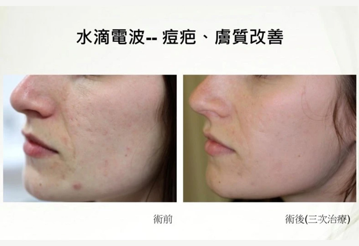 因為水滴電波可以減少油脂分泌,改善角質代謝,所以針對正在發炎的痘痘和痘疤,也有一併改善的效果。